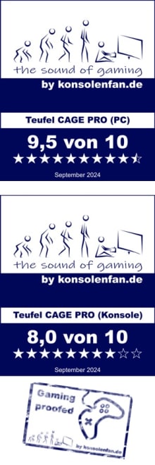„Das Teufel Cage Pro bringt viele Anschlussmöglichkeiten mit und sorgt mit der Teufel Audio Software für weitere Funktionen. Für uns ist es beim Zocken ein herausragender Klang gewesen und konnte uns absolut überzeugen. Nur das unflexible Mikrofon und der etwas zu hohe Preis könnte man als Kritikpunkte sehen. Ansonsten zeigt Teufel wieder eindrucksvoll warum sie zu den Besten auf den Markt gehören.“